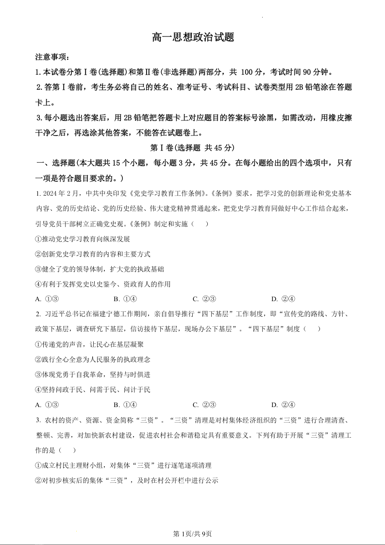 山东省滨州市2023-2024学年下学期高一年级期末考试政治(原卷版)