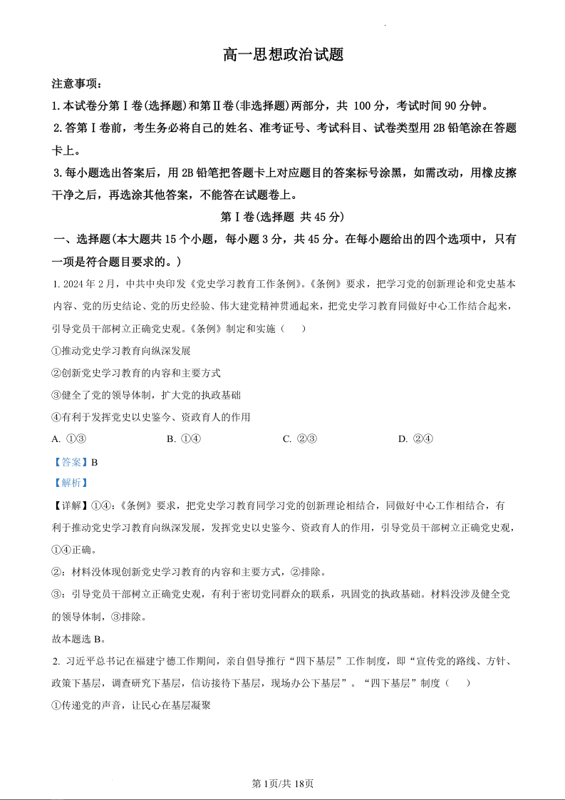 山东省滨州市2023-2024学年下学期高一年级期末考试政治(精品解析版)
