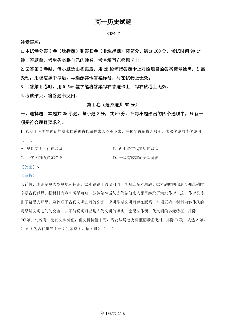 山东省滨州市2023-2024学年下学期高一年级期末考试历史(精品解析版)