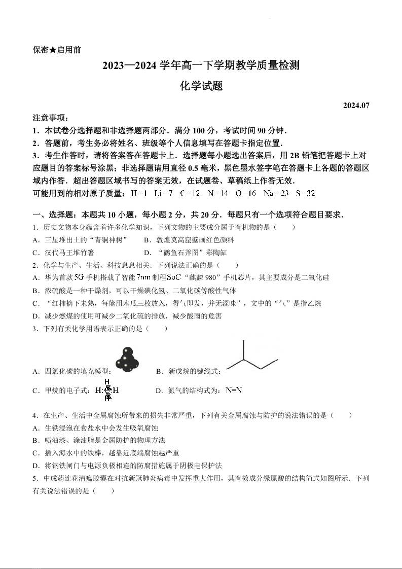 山东省菏泽市2023-2024学年高一下学期7月期末考试化学