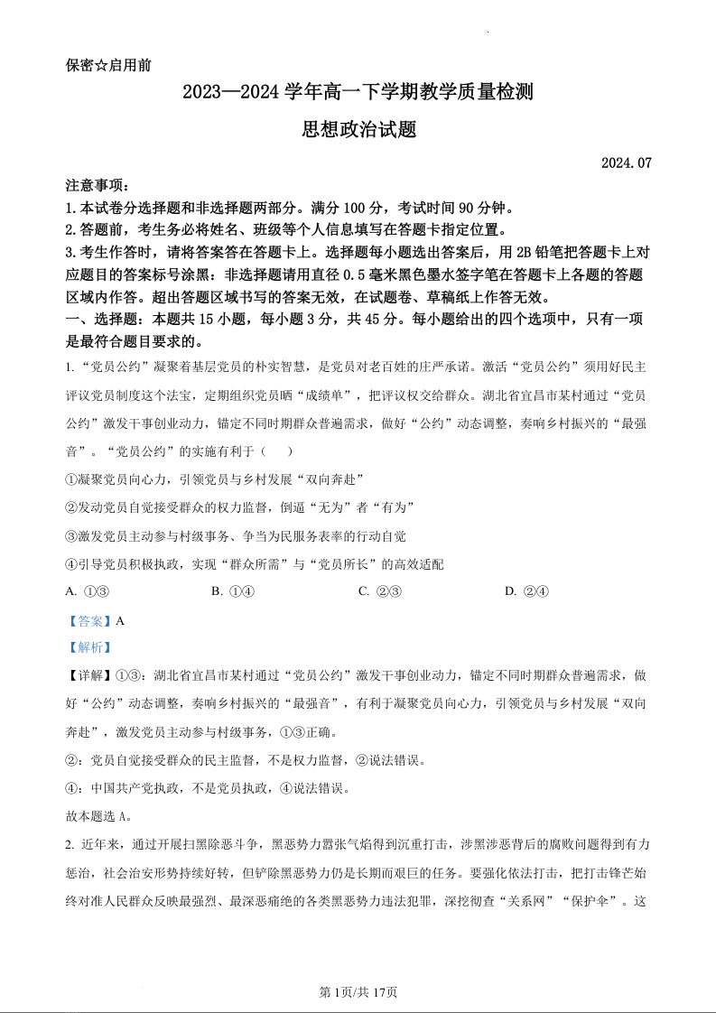 山东省菏泽市2023-2024学年高一下学期7月期末考试政治(精品解析版)
