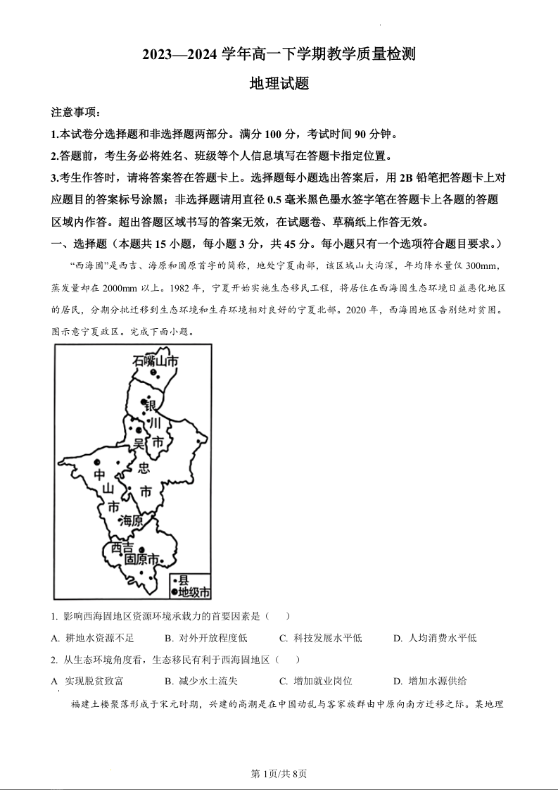 山东省菏泽市2023-2024学年高一下学期7月期末考试地理(原卷版)