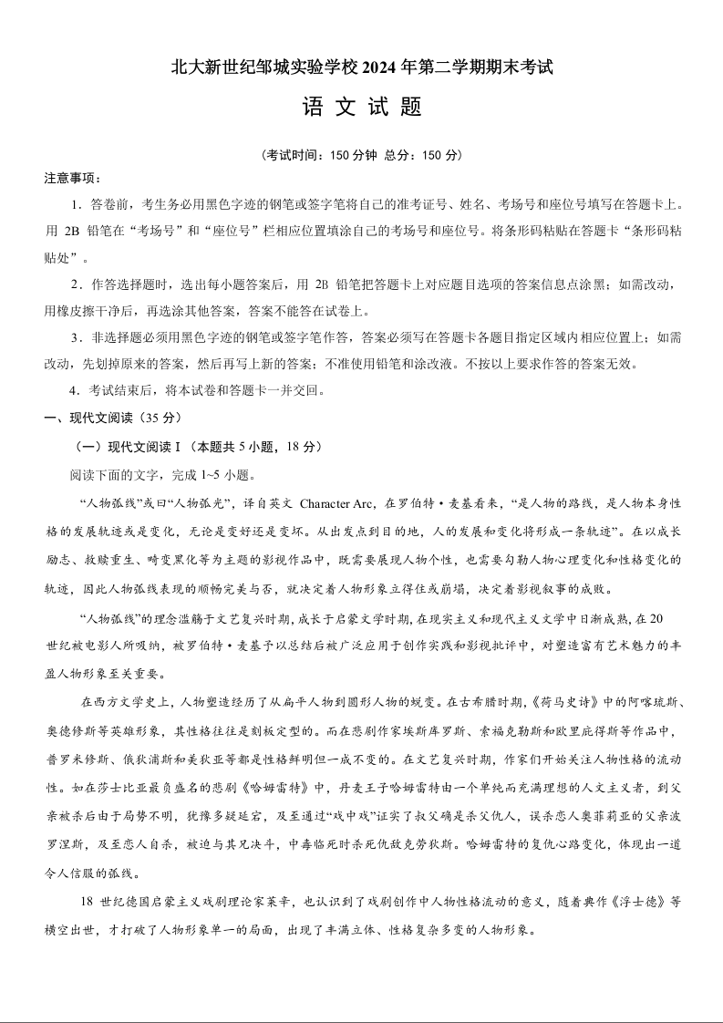 山东省济宁市邹城市2023-2024学年高一下学期7月期末考试语文+答案