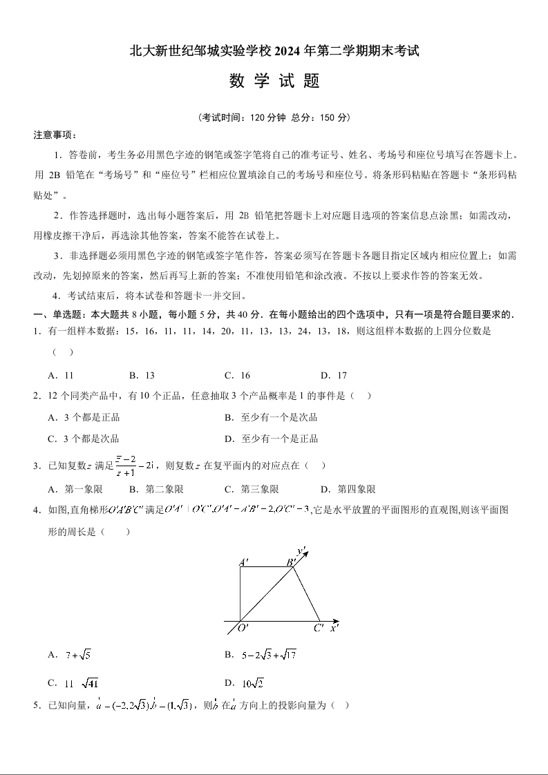 山东省济宁市邹城市2023-2024学年高一下学期7月期末考试数学+答案