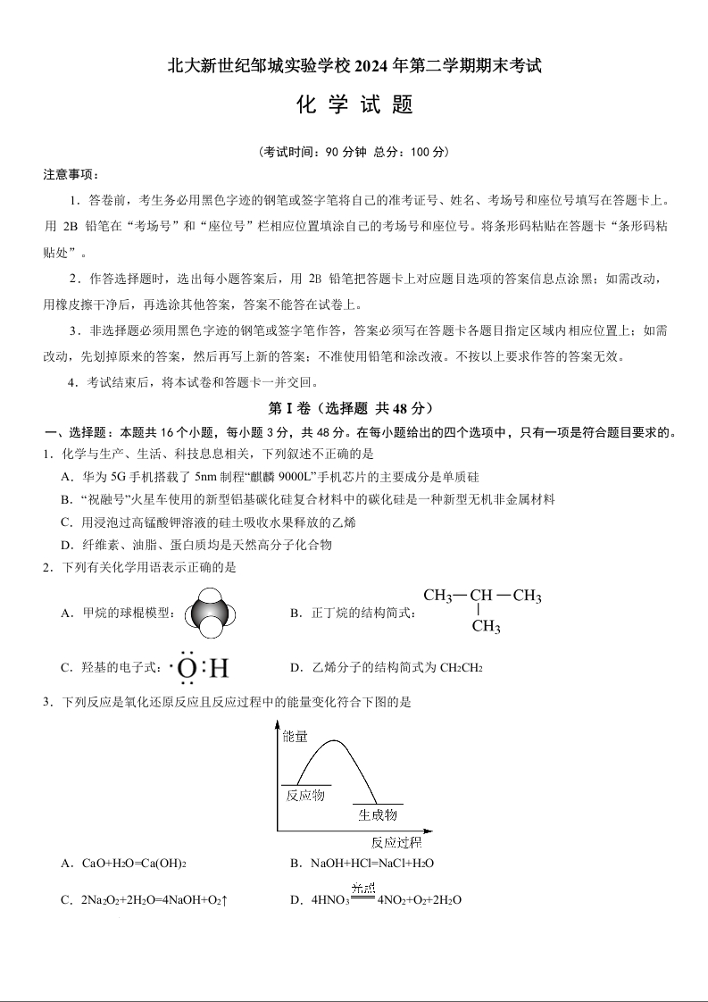 山东省济宁市邹城市2023-2024学年高一下学期7月期末考试化学+答案