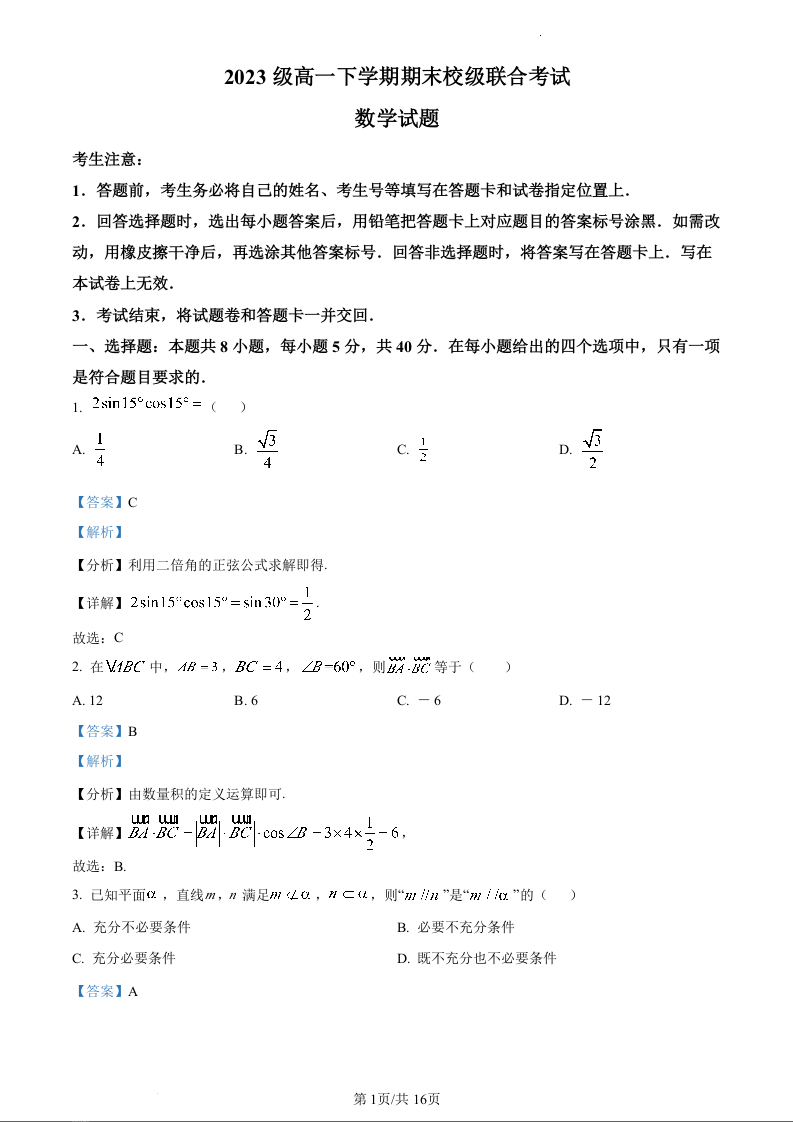 山东省日照市2023-2024学年高一下学期期末考试数学(精品解析版)