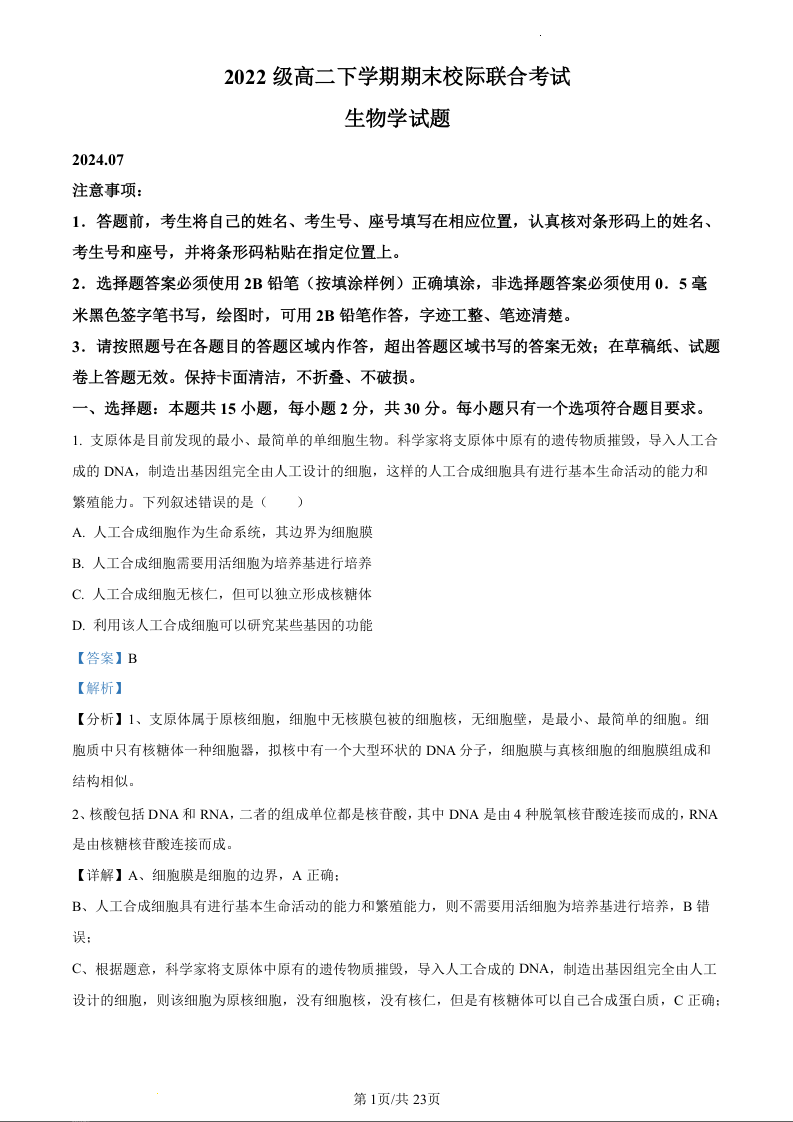 山东省日照市2023-2024学年高一下学期期末考试生物(精品解析版)