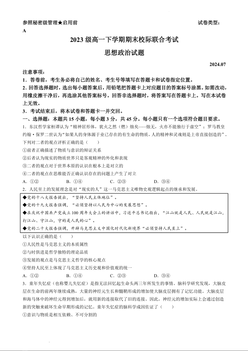 山东省日照市2023-2024学年高一下学期期末考试政治