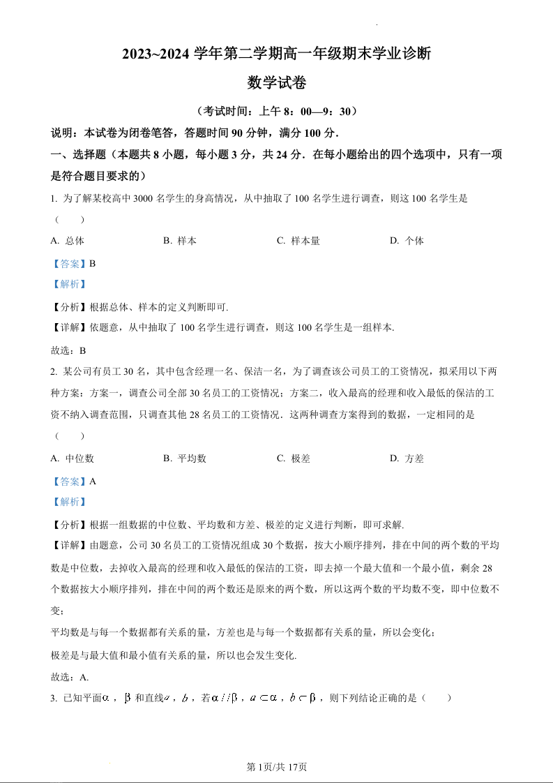 山西省太原市2023-2024学年高一下学期期末考试数学(精品解析版)