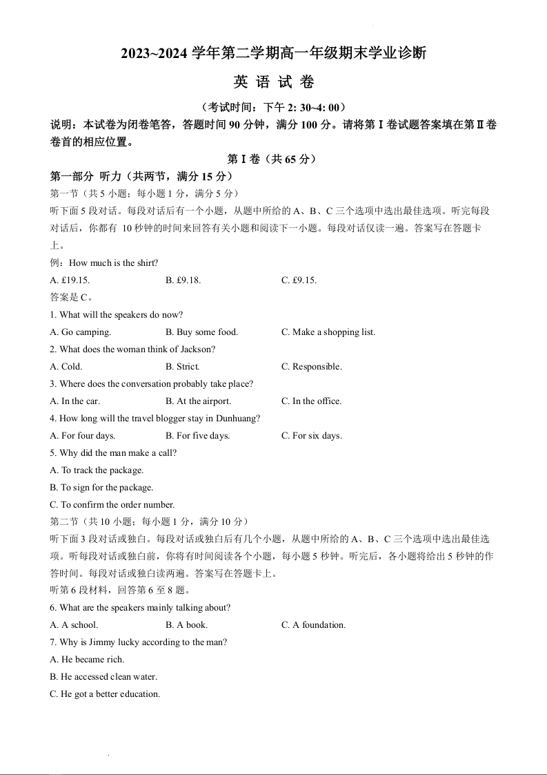 山西省太原市2023-2024学年高一下学期期末考试英语