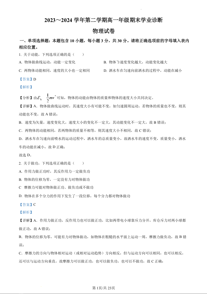 山西省太原市2023-2024学年高一下学期期末考试物理(精品解析版)