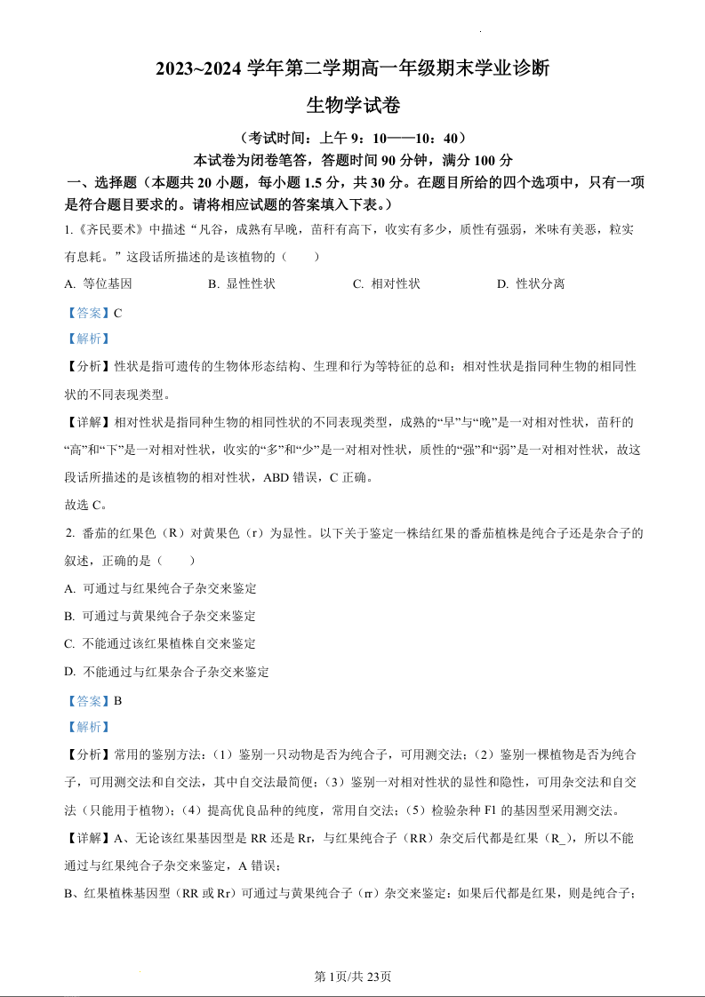 山西省太原市2023-2024学年高一下学期期末考试生物(精品解析版)