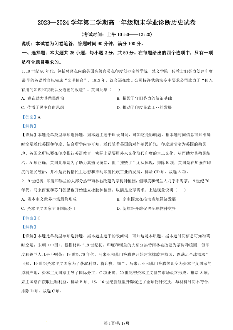 山西省太原市2023-2024学年高一下学期期末考试历史(精品解析版)