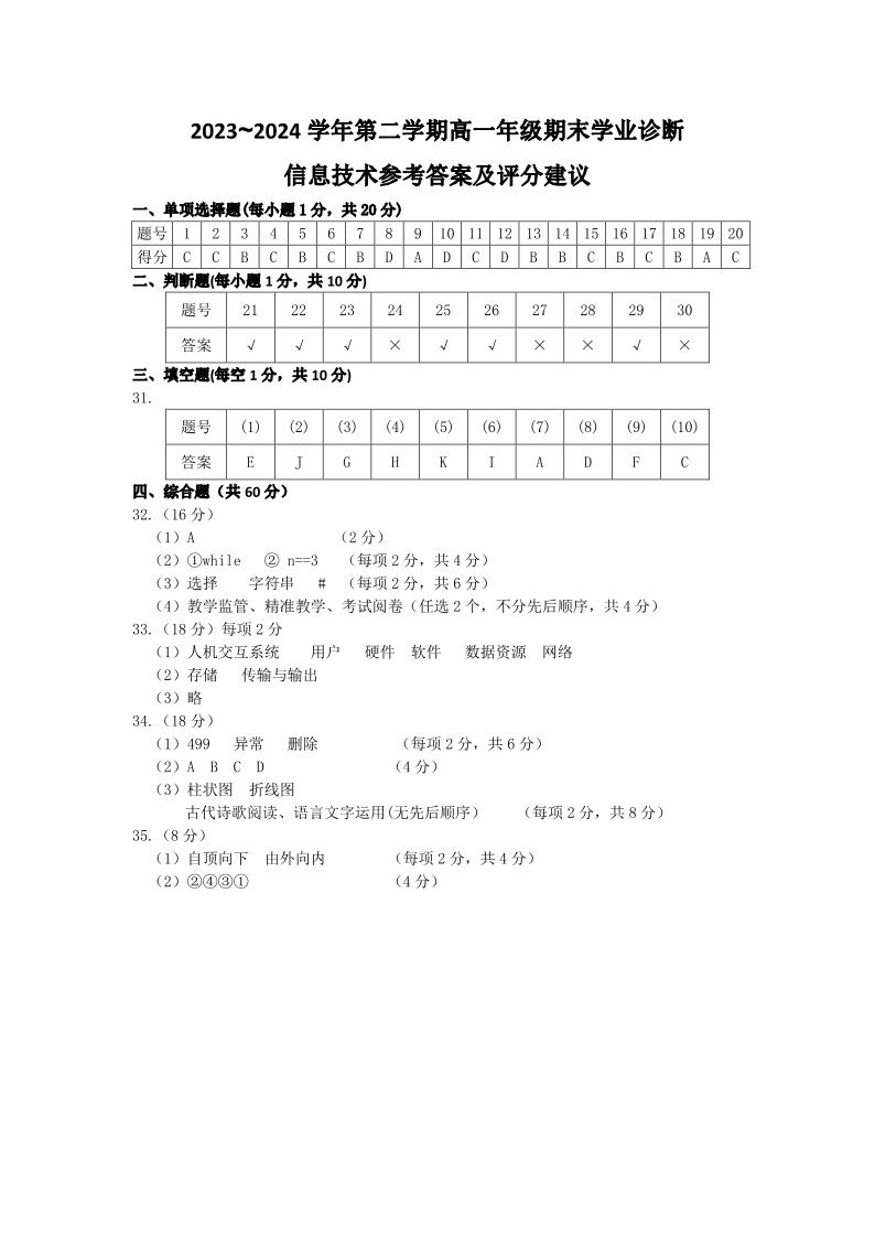 山西省太原市2023-2024学年高一下学期期末考试信息技术答案
