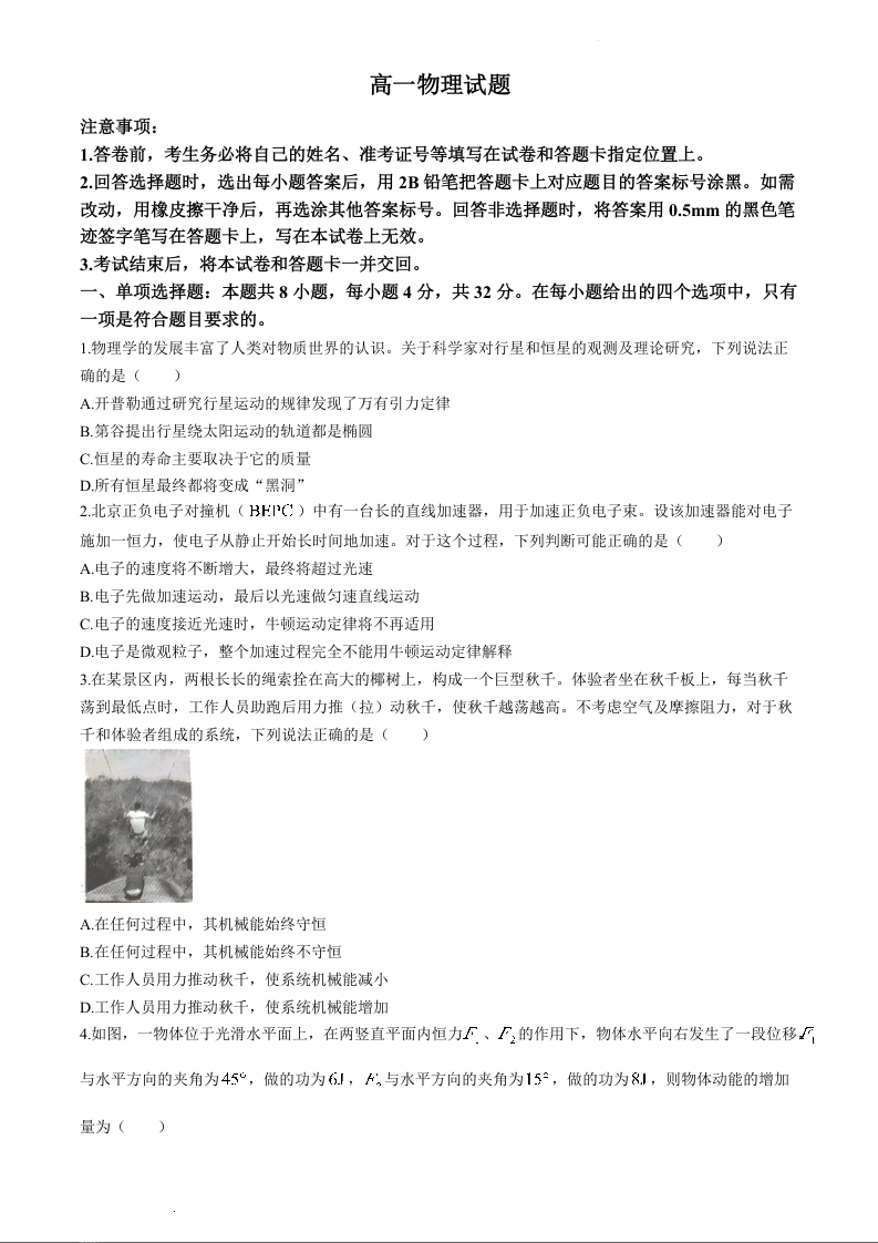 山西省长治市2023-2024学年高一下学期7月期末考试物理