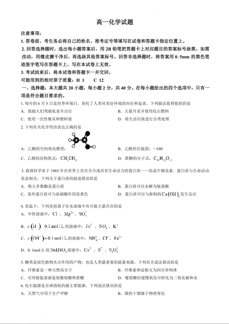 山西省长治市2023-2024学年高一下学期7月期末考试化学