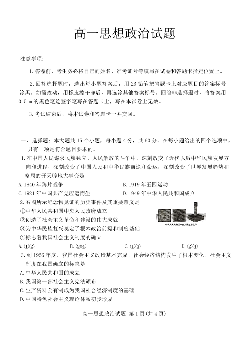 山西省长治市2023-2024学年高一下学期7月期末考试政治
