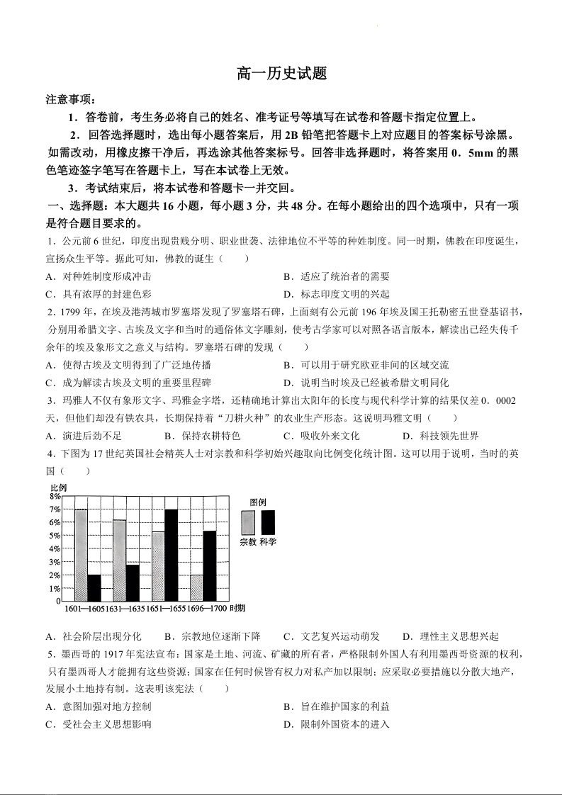 山西省长治市2023-2024学年高一下学期7月期末考试历史