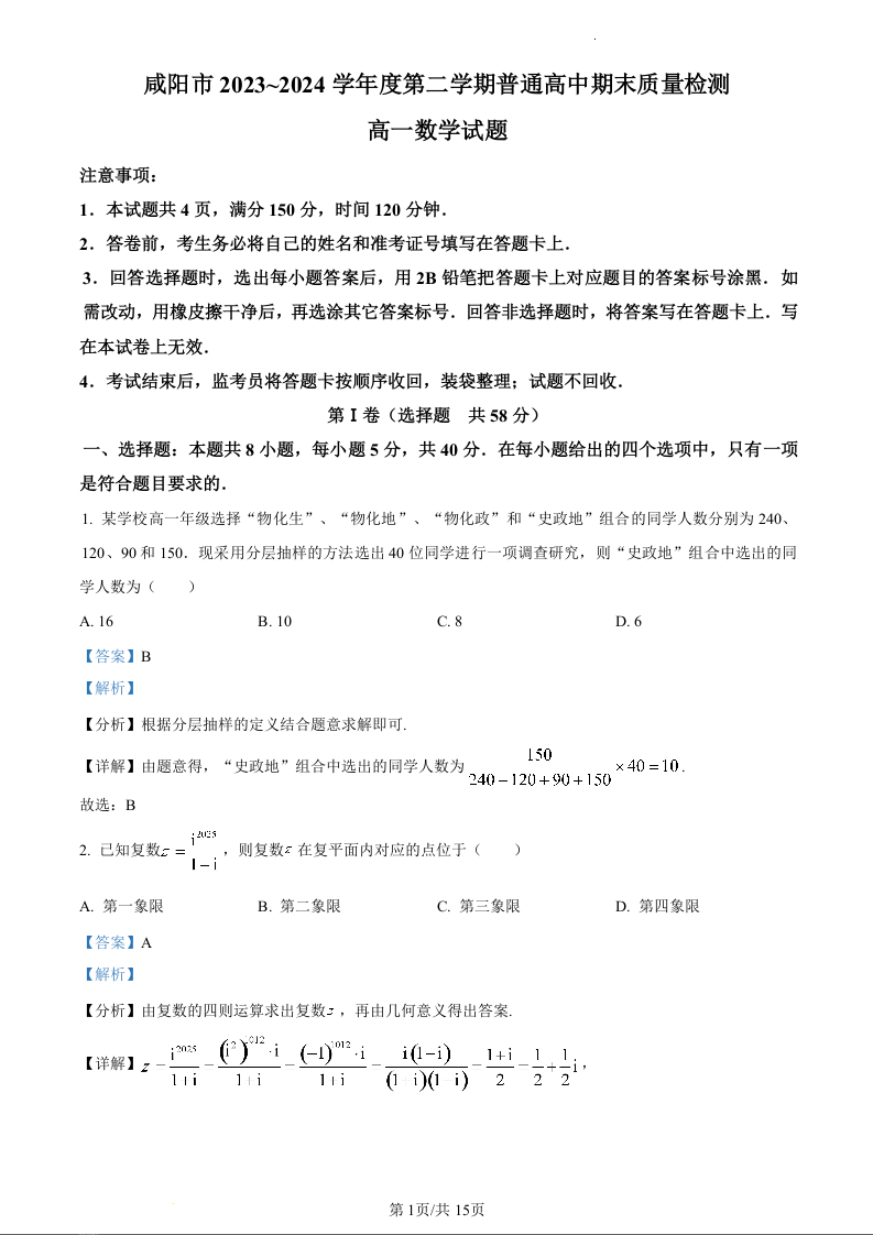 陕西省咸阳市2023-2024学年高一下学期7月期末考试数学(精品解析版)