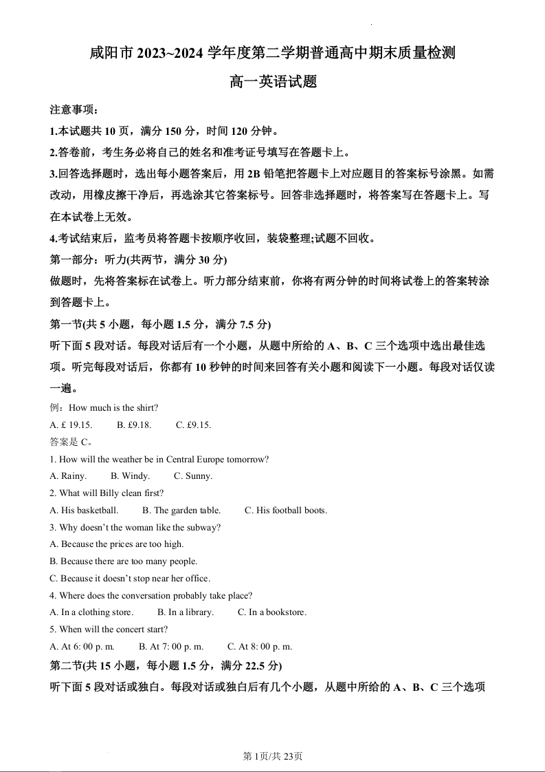 陕西省咸阳市2023-2024学年高一下学期7月期末考试英语(精品解析版)