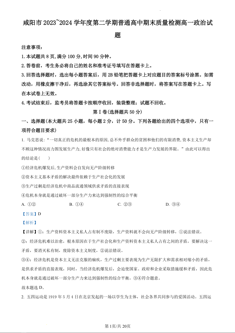 陕西省咸阳市2023-2024学年高一下学期7月期末考试政治(精品解析版)