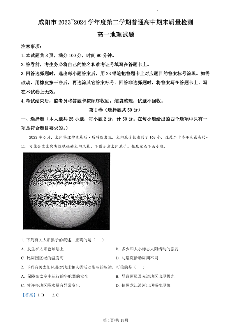 陕西省咸阳市2023-2024学年高一下学期7月期末考试地理(精品解析版)