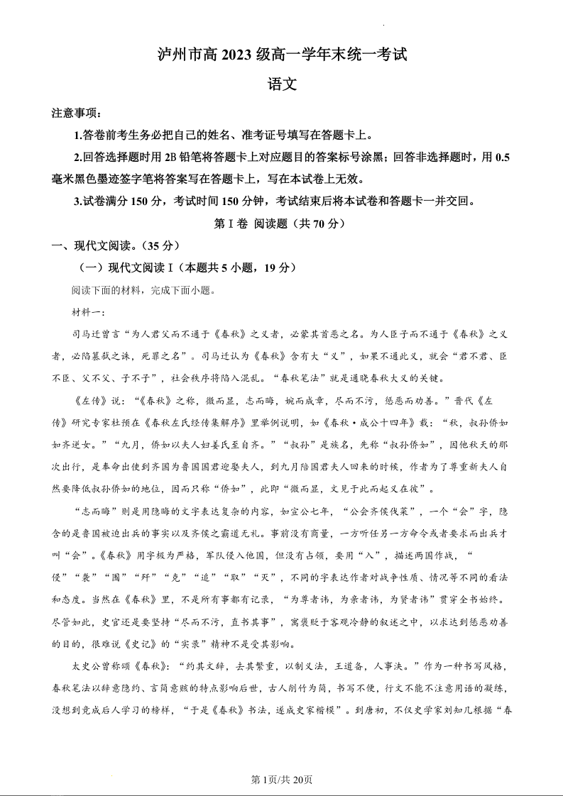 四川省泸州市2023-2024学年高一下学期7月期末考试语文(精品解析版)