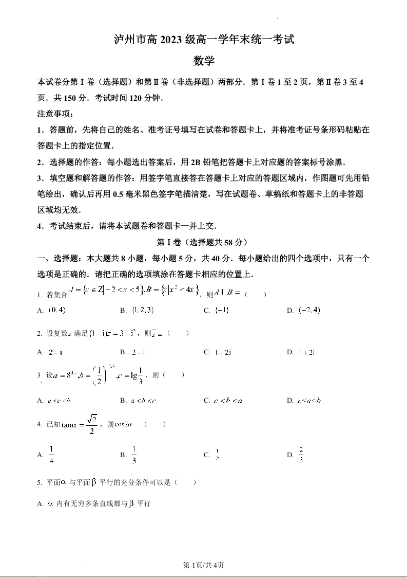 四川省泸州市2023-2024学年高一下学期7月期末考试数学(原卷版)