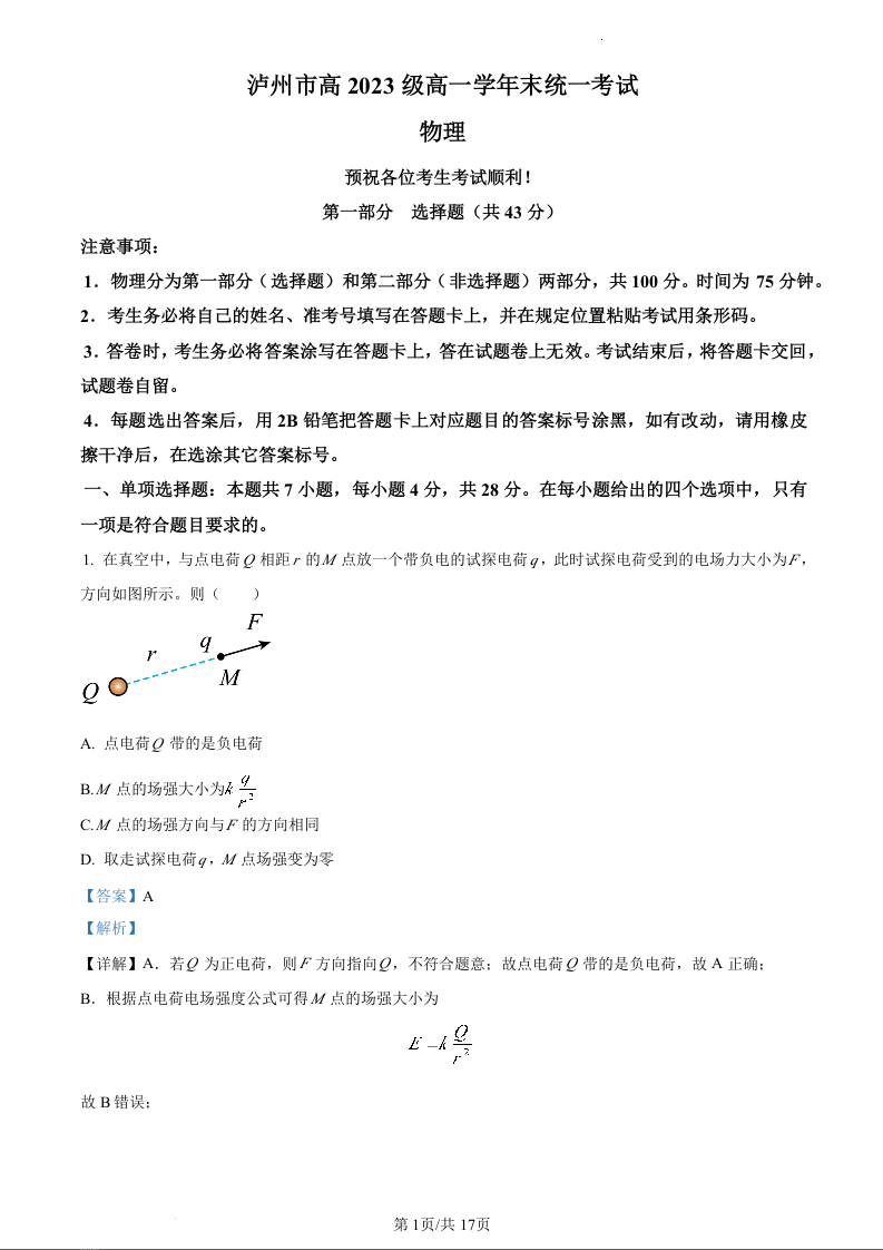 四川省泸州市2023-2024学年高一下学期7月期末考试物理(精品解析版)