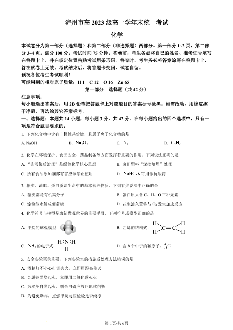 四川省泸州市2023-2024学年高一下学期7月期末考试化学(原卷版)