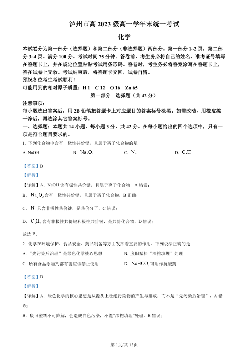 四川省泸州市2023-2024学年高一下学期7月期末考试化学(精品解析版)