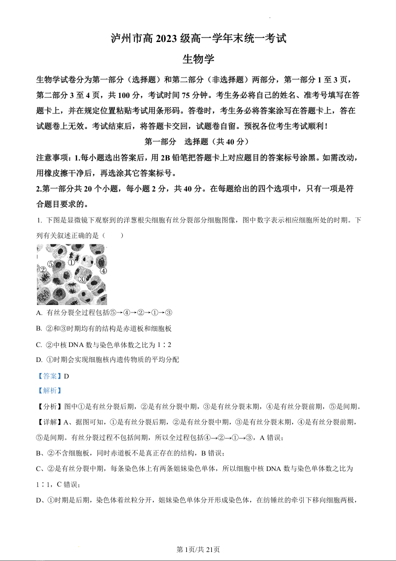 四川省泸州市2023-2024学年高一下学期7月期末考试生物(精品解析版)