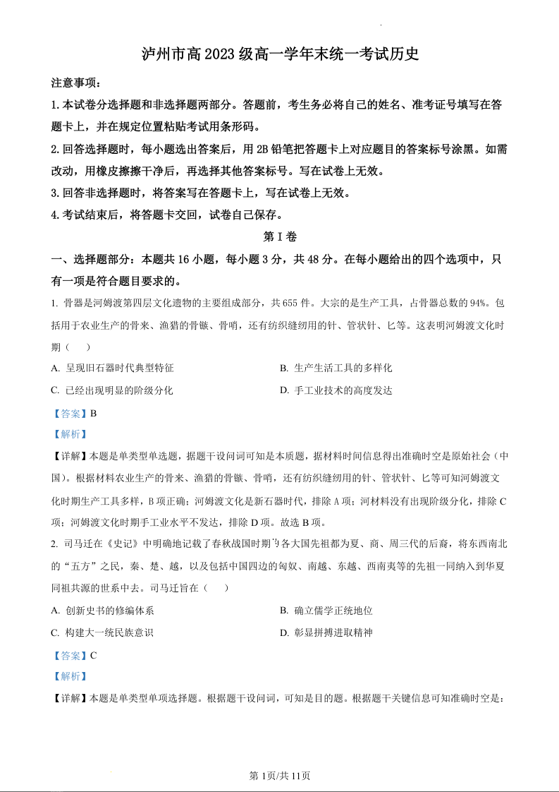 四川省泸州市2023-2024学年高一下学期7月期末考试历史(精品解析版)