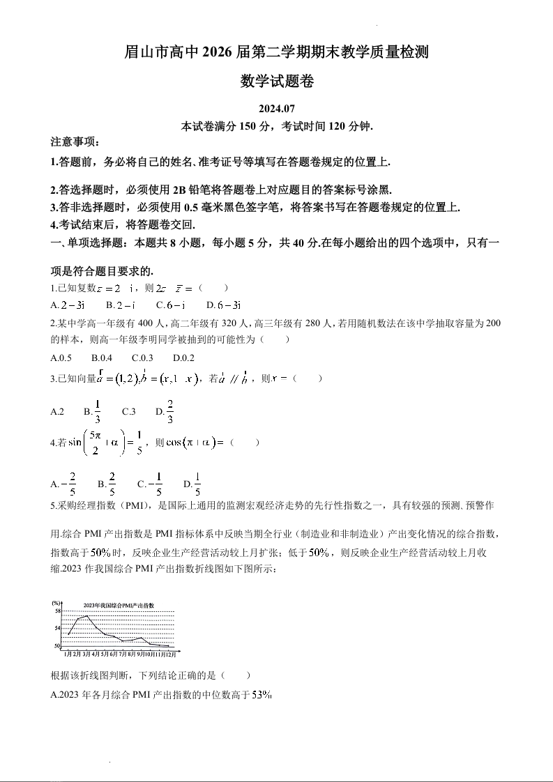 四川省眉山市2023-2024学年高一下学期7月期末联考数学