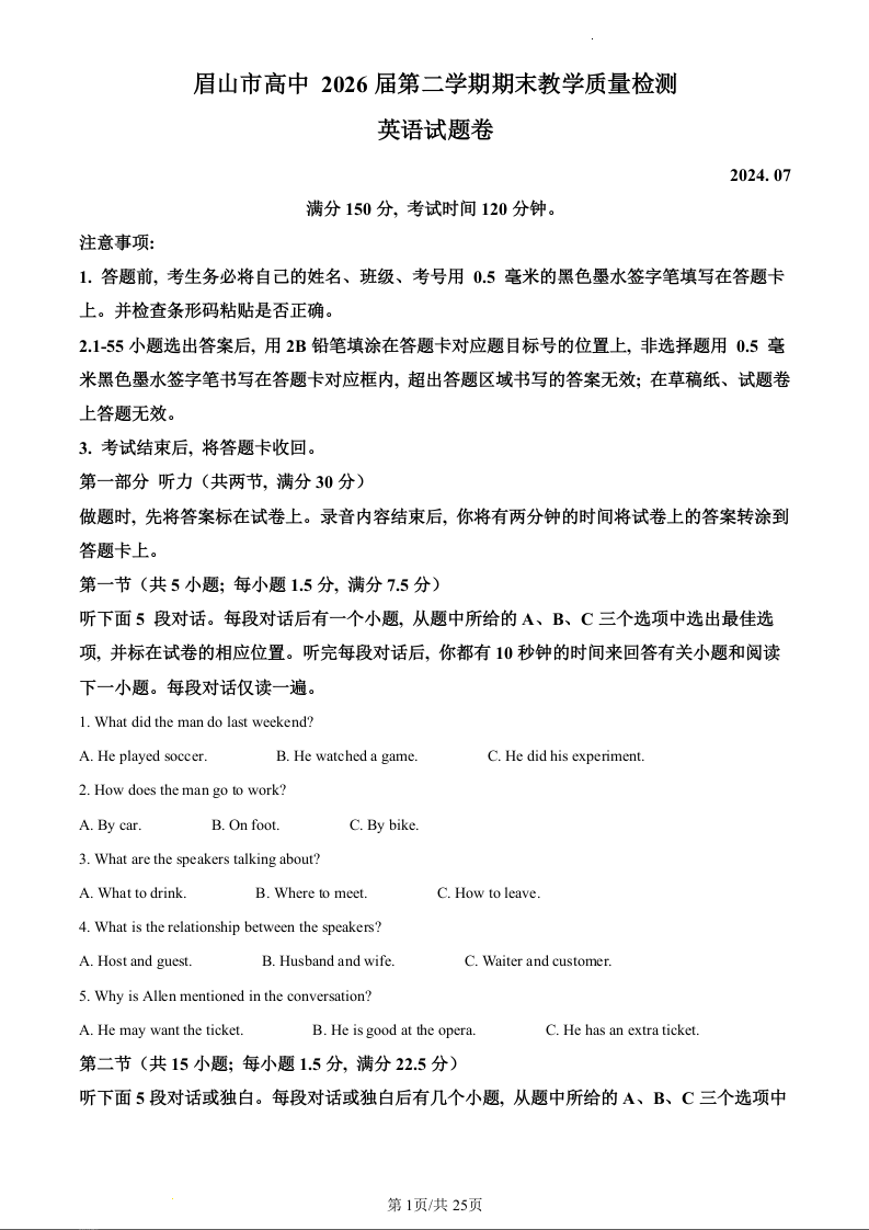 四川省眉山市2023-2024学年高一下学期7月期末联考英语(精品解析版)
