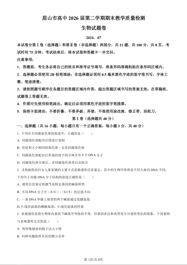 四川省眉山市2023-2024学年高一下学期7月期末联考生物(原卷版)