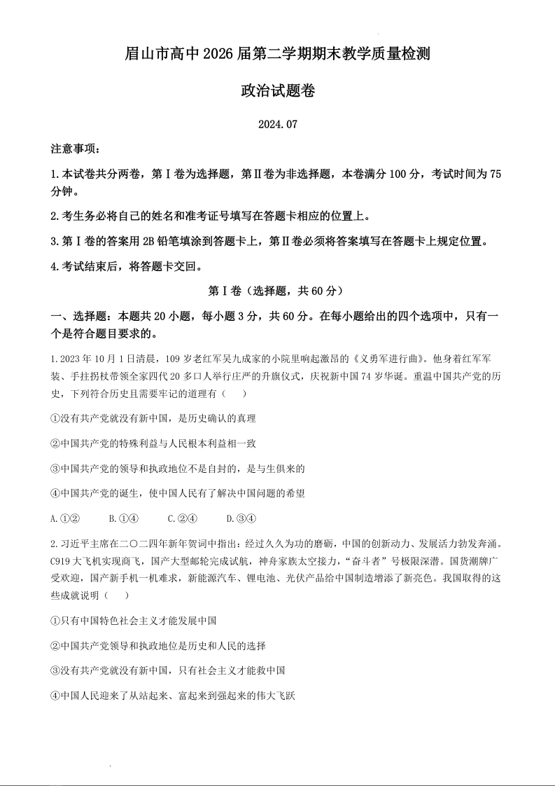 四川省眉山市2023-2024学年高一下学期7月期末联考政治