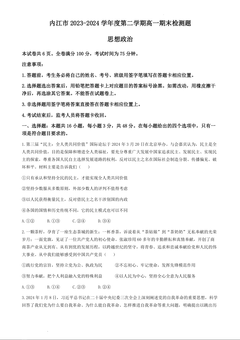 四川省内江市2023-2024学年高一下学期期末考试政治+答案