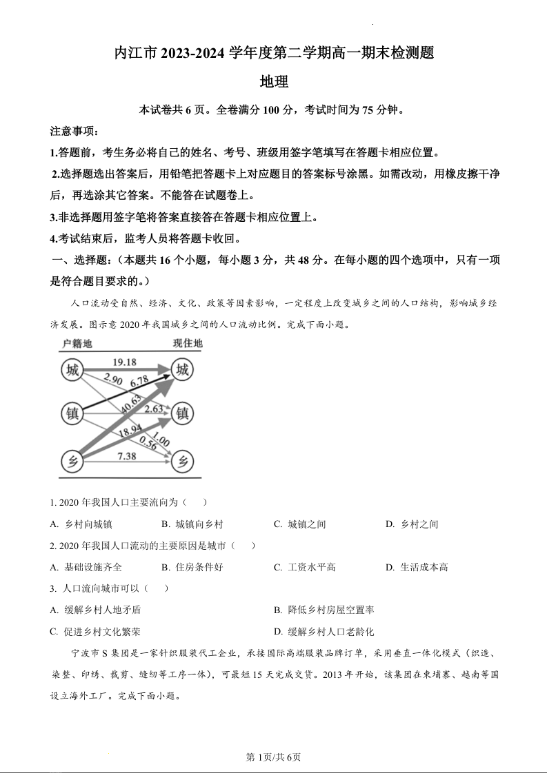 四川省内江市2023-2024学年高一下学期期末考试地理(原卷版)