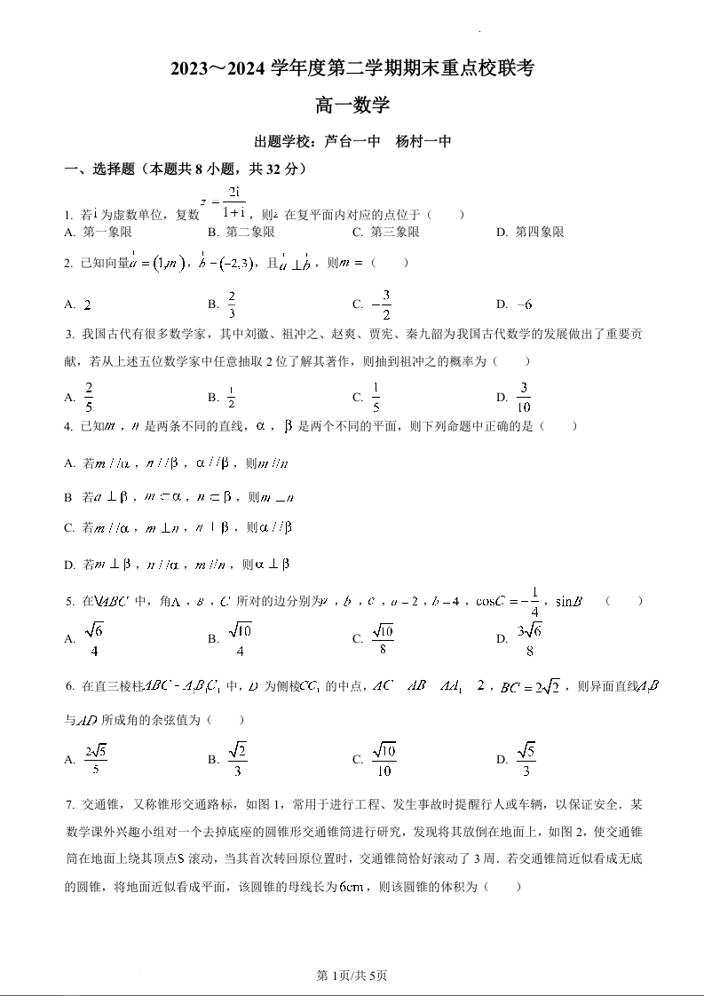 天津市五区县重点校联考2023-2024学年高一下学期7月期末考试数学(原卷版)