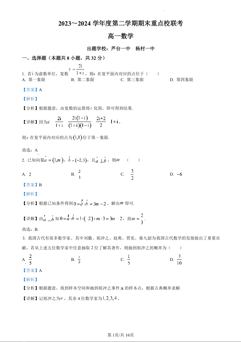 天津市五区县重点校联考2023-2024学年高一下学期7月期末考试数学(精品解析版)