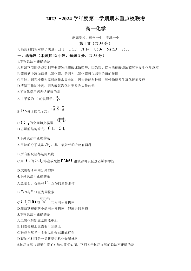天津市五区县重点校联考2023-2024学年高一下学期7月期末考试化学+答案