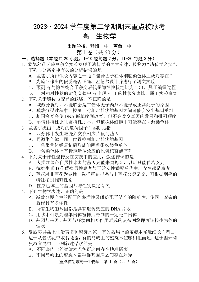 天津市五区县重点校联考2023-2024学年高一下学期7月期末考试生物