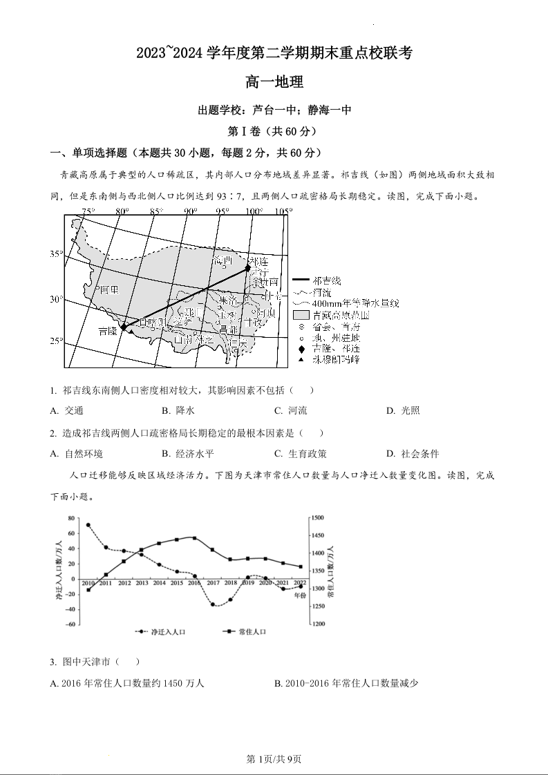天津市五区县重点校联考2023-2024学年高一下学期7月期末考试地理(原卷版)
