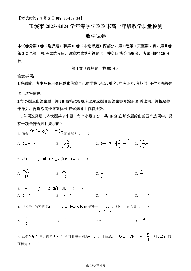云南省玉溪市2023-2024学年高一下学期期末教学质量检测数学(原卷版)