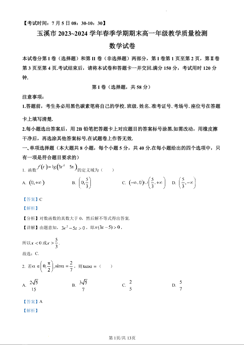 云南省玉溪市2023-2024学年高一下学期期末教学质量检测数学(精品解析版)