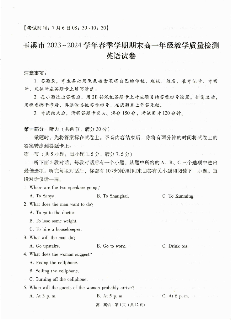 云南省玉溪市2023-2024学年高一下学期期末教学质量检测英语