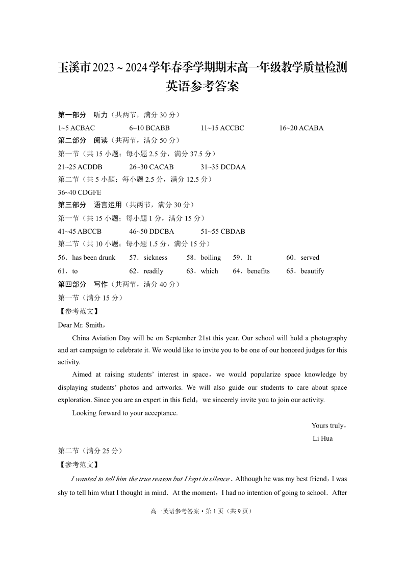 云南省玉溪市2023-2024学年高一下学期期末教学质量检测英语答案
