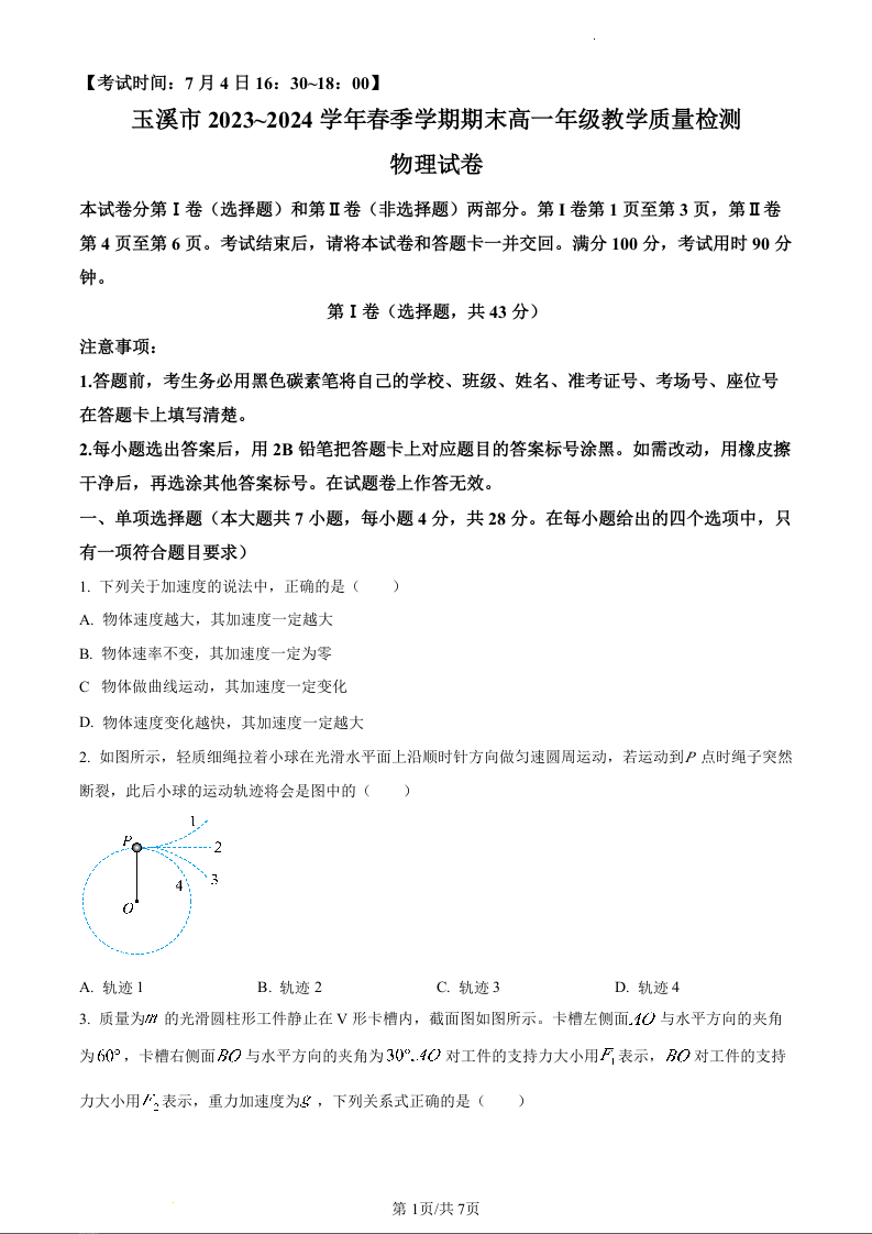 云南省玉溪市2023-2024学年高一下学期期末教学质量检测物理(原卷版)