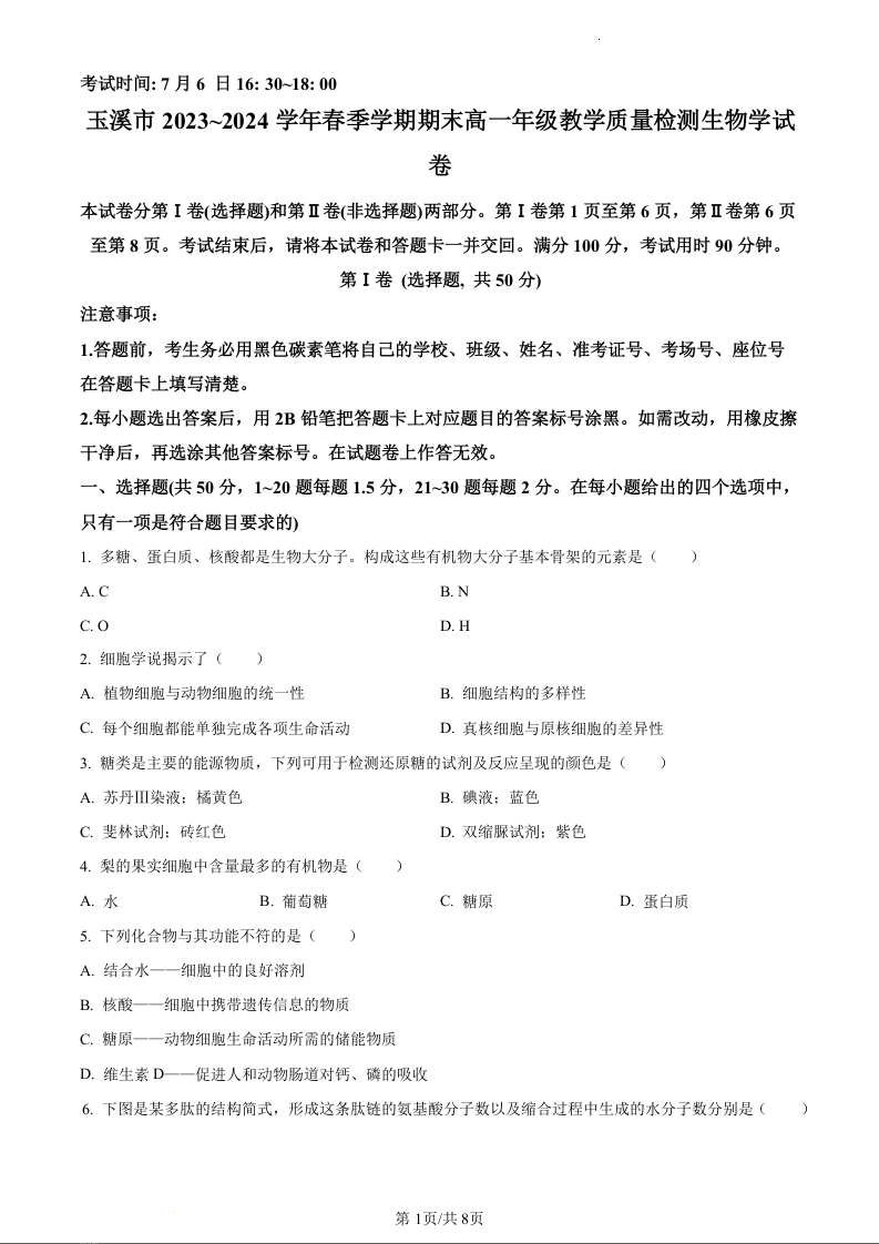 云南省玉溪市2023-2024学年高一下学期期末教学质量检测生物(原卷版)
